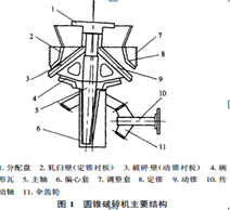 大理石圓錐破碎機(jī)主要由分配盤、定錐、軋臼壁、動(dòng)錐、破碎壁、調(diào)整套、傘齒輪、傳動(dòng)軸、碗形瓦和偏心套等部分組成(見下圖)。