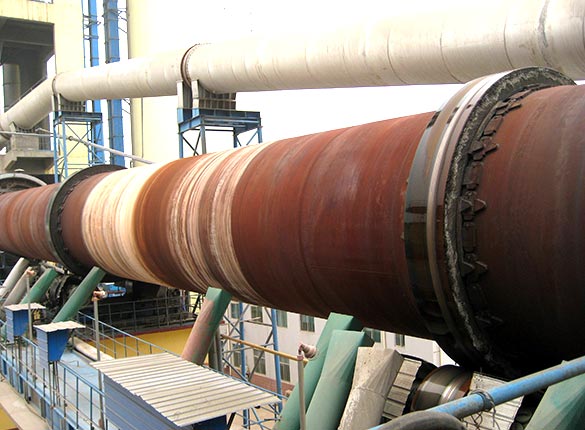 生料粉從回轉(zhuǎn)窯尾體高處的下料管進(jìn)入窯筒體內(nèi),筒體與水平線成規(guī)定的斜度,在傳動裝置的驅(qū)動下筒體旋轉(zhuǎn),物料在筒體內(nèi)沿圓周方向翻滾的同時,沿軸線由窯尾向窯頭移動;在窯頭有燃燒器將燃油或煤粉噴人已點(diǎn)燃的窯內(nèi),所形成的火焰或熱氣向窯尾流動,物料粉在移動的過程中被加熱煅燒,同時物料粉在加熱和煅燒過程中也發(fā)生了物理和化學(xué)反應(yīng),煅燒成熟料由窯頭卸出進(jìn)入冷卻機(jī)。