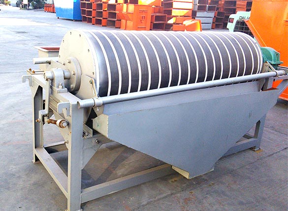礦粒經(jīng)輸送帶被送入上磁輥分選,由于礦粒有磁性,立即被強磁場吸附在磁輥上,而脈石粒由于沒有磁性,磁輥的強磁對它不產(chǎn)生吸力,隨著磁輥的轉(zhuǎn)動,礦粒一直被吸在磁輥上,而脈石粒在磁輥轉(zhuǎn)到前端位置時被拋出掉在隔礦板的前面,礦粒繼續(xù)被磁輥帶到脫磁區(qū)時自動掉入一選集礦斗收集為精礦成品。由于上磁輥掉下的脈石中還夾帶有一些磁性更弱的礦粒,它們將進入下磁輥繼續(xù)進行磁選,磁選后的成品礦粒進入二選集礦斗收集為成品,被拋出的脈石經(jīng)尾礦口排出,至此磁選工序結(jié)束。